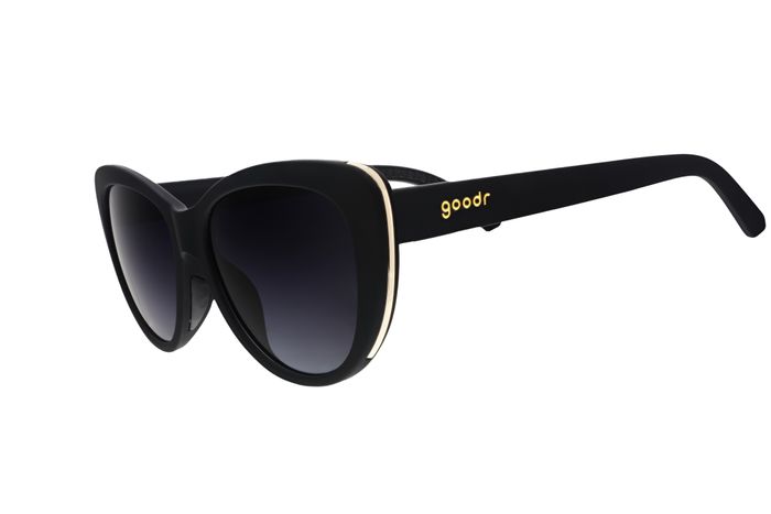These black cat-eye sunglasses with black non-reflective lenses & light gold accents are giving fashion icon. Won't slip or bounce when vogueing down the catwalk or the sidewalk.