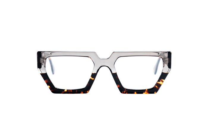 The Noah frame redefines elegance through a bold dialogue between heritage and contemporary design. Its geometric silhouette remains expressive and architectural, now rendered in a cooler palette: translucent gray acetate meets the organic warmth of tortoiseshell, creating a subtle interplay of texture, depth, and tonal contrast. This chromatic tension evokes quiet confidence and modern refinement — a design that speaks through balance rather than excess. Meticulously handcrafted, Noah embodies SASU’s philosophy of merging art, style, and human touch into timeless design. It stands as a sculptural statement — intentional, versatile, and unmistakably distinctive.