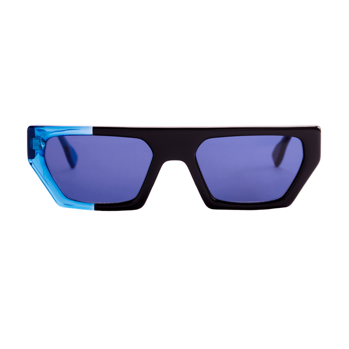 Lucca is geometry in its most expressive form — a frame that embraces structure, contrast, and contemporary attitude. Its clean angular silhouette in deep black acetate establishes a bold architectural foundation, while the translucent electric blue adds depth and luminosity, creating a dynamic tension between shadow and light. The geometric front enhances its architectural presence and gives the design a sculptural, almost futuristic flair.